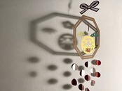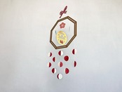 末広がりを意味した八角形の枠の中に、松・竹・梅・だるまのパーツを配置して、更に水引と紅白玉を盛り込み縁起のよいモチーフばかりを集めた作品に仕上げました。